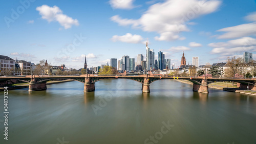 © Alexander, Fototapeta premium Frankfurt, Germany - March 31, 2020: frankfurt skyline view with ignas bubis bridge during daytime