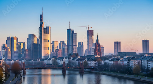 Fototapeta premium Frankfurt Skyline at Dawn: Panoramic View of Modern Architecture and River...