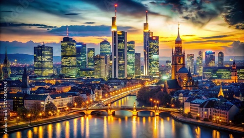 Fototapeta premium Frankfurt Skyline at Night with Bokeh Lights, Germany Cityscape Panorama