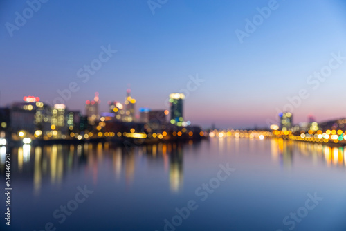 © Marc Dyck, Fototapeta premium Frankfurt Skyline in der Abenddämmerung – unscharf