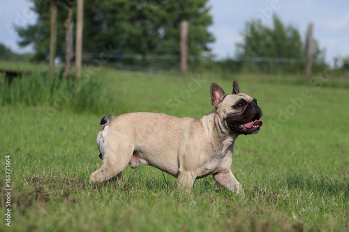 © Bianca, Fototapeta premium französische bulldogge hat spaß im garten