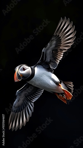© Sukumar, Naklejka premium Fratercula artica in flight, a beautiful Atlantic Puffin ai generated photo