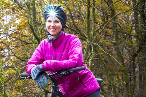 Naklejka premium Frau auf dem Mountainbike mit Stirnlampe