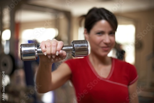 © Christian Schwier, Obraz premium Frau beim Hanteltraining im Fitnessstudio