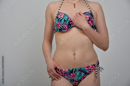 Naklejka premium frau, bikini, schönheit, körper, leitbild, glamour, abspecken, gestalten, damenunterwäsche, dessous, bh, haar, haut, leute, badeanzug, akt, brünett, atelier, heiss, sinnlich, bauch, person, brust, sin