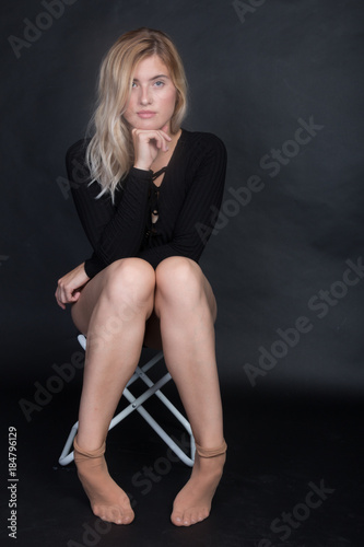 © SinnedNa, Fototapeta premium Frau im Body auf Stuhl im Fotostudio