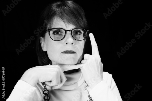 © Rüdiger , Fototapeta premium Frau mit Brille und erhobenem Finger als Schwarzweißporträt