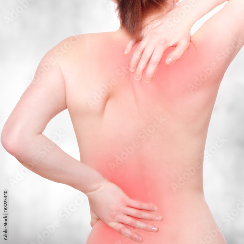 © SENTELLO, Fototapeta premium Frau mit Rückenschmerzen und Schulterschmerzen