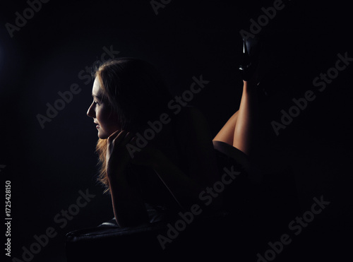 © fotoak80, Naklejka premium frau, schönheit, gestalten, haar, black, leitbild, dark, liegend, schatten, lowkey, beine, bett, romantzisch, erotik, glamour, bekleidung, gesicht, person, atelier, elegant, leute, sinnlich, auge, lan