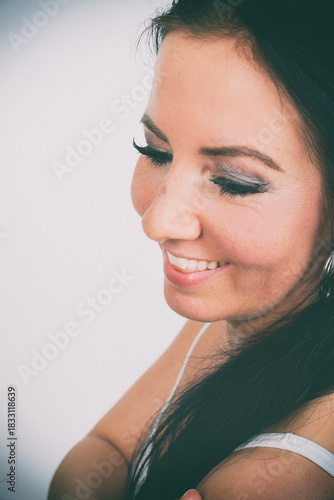 © fotoak80, Naklejka premium frau, schönheit, lächelnd, lächeln, haar, leitbild, gesicht, fröhlichkeit, brünett, person, leute, gestalten, close up, auge, black, 1