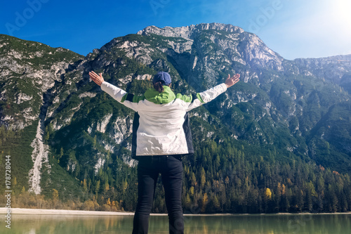 © Black Brush, Naklejka premium Frau steht mit ausgestreckten Armen vor großen majestätischen Bergen Panorama Rückansicht