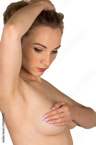© Timo Blaschke, Obraz premium Frau verdeckt Brust mit Händen