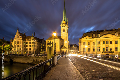 Fototapeta premium Fraumuenster church at night, Zurich