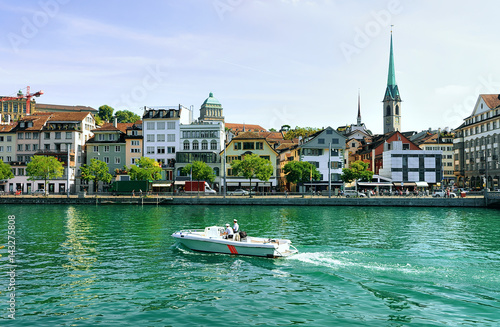 © Roman Babakin, Obraz premium Fraumunster Church and motor boat at Limmat Zurich