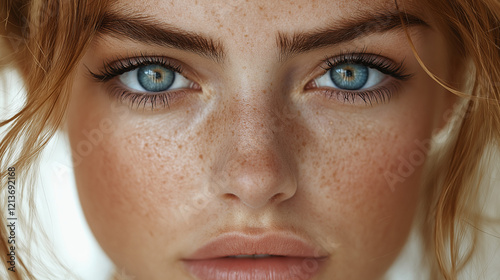 © AIrina, Fototapeta premium Freckled model's face in close-up with natural makeup