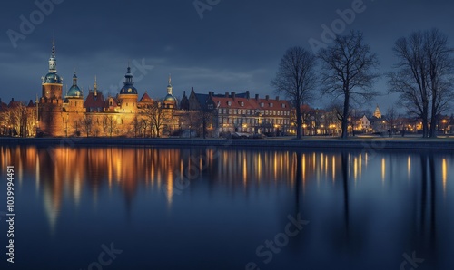 Naklejka premium Frederiksborg Castle, in the town of Hillered on Lake Slotsse. Panorama. Denmark. XVI century. Copenhagen, Denmark, Europe