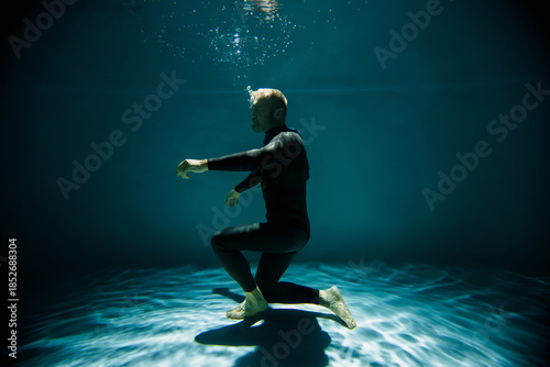 © Dmytro Hai, Fototapeta premium Free diver in wetsuit holding breath while training underwater in pool