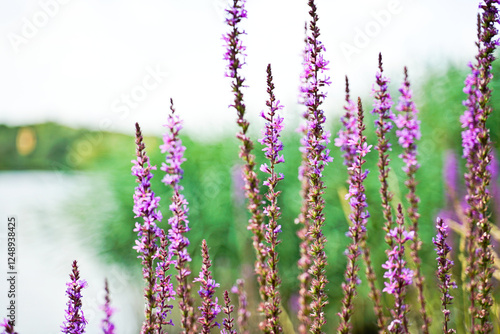 © nuehnenfoto, Fototapeta premium Free growing lavender by a lake