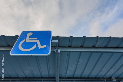 Obraz premium Free parking space reserved for the handicapped with the international handicap symbol painted in white on bright blue on a plaque on the top of the roof of the reserved space under the cloudy sky.