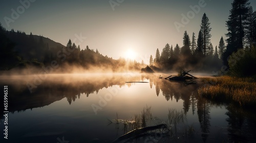 Fototapeta premium Free Photo of A breathtaking sunrise over a serene mountain lake, with mist rising from the water, pine trees on the shore