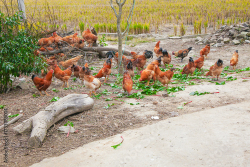 © Nguyen, Fototapeta premium Free Range Chickens Foraging on Local Organic Farm - Sustainable Poultry Agriculture
