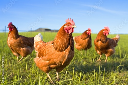 © altitudevisual, Fototapeta premium free-range chickens in grassy field
