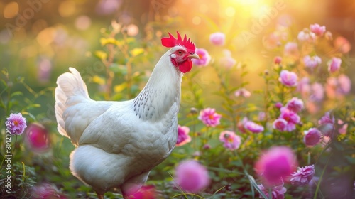 Fototapeta premium Free range white leghorn chickens in the summer garden