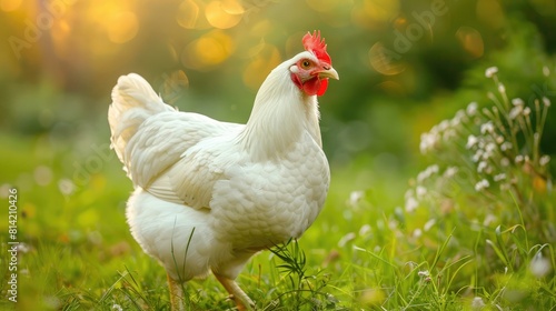 Fototapeta premium Free range white leghorn chickens in the summer garden