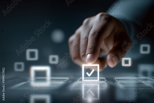 © filmanana, Naklejka premium Free-Running Hand Selecting Digital Checkbox for High-Tech Decision-Making in a Futuristic