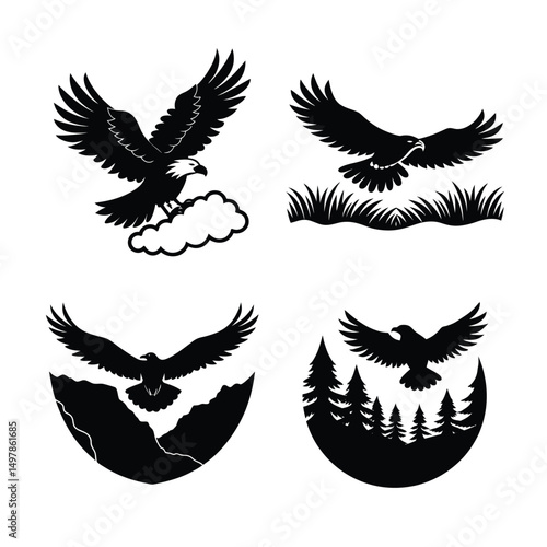 © Jannatun, Obraz premium Freedom Flight – Eagle Silhouette with Flag and Forest Backdrop