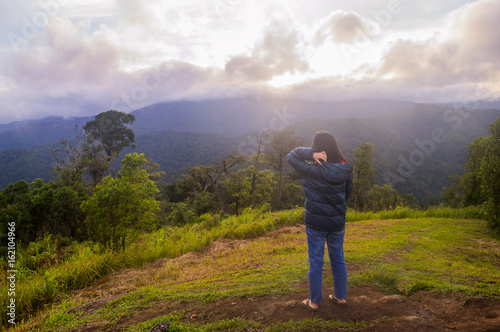© khlongwangchao, Fototapeta premium freedom girl with hands up in the mountains against sun
