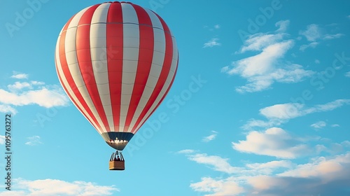 © Nitchalee N., Naklejka premium freedom movement and authentic, A vibrant hot air balloon with red and white stripes floats against a clear blue sky, surrounded by fluffy clouds.