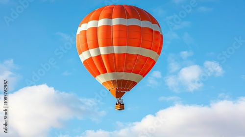 © Nitchalee N., Naklejka premium freedom movement and authentic, A vibrant orange hot air balloon floats against a bright blue sky, surrounded by fluffy white clouds.