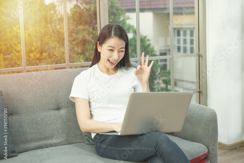 © mkitina4, Naklejka premium Freelance Jobs workation concept.Positive smile asian girl sitting on sofa with laptop and showing ok sign.