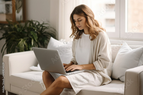 © Enigma, Fototapeta premium Freelance woman in glasses typing at laptop and working from home office