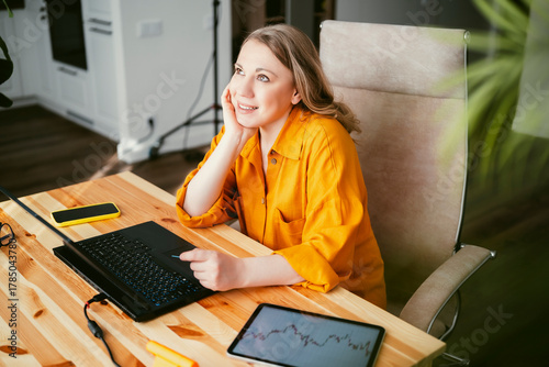 © 5ph, Naklejka premium Freelancer enjoying home office thinks about purchases and managing projects for clients and focusing on career success