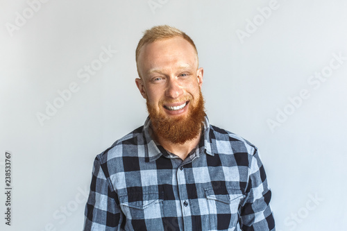 © Viktoriia, Obraz premium Freestyle. Mature man standing isolated on grey smiling cheerful close-up