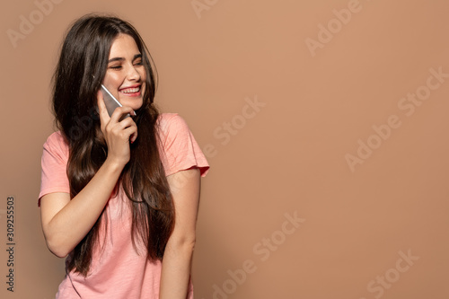 © Viktoriia, Fototapeta premium Freestyle. Young girl in t-shirt standing studio isolated on brown talking on smartphone laughing joyful copy space