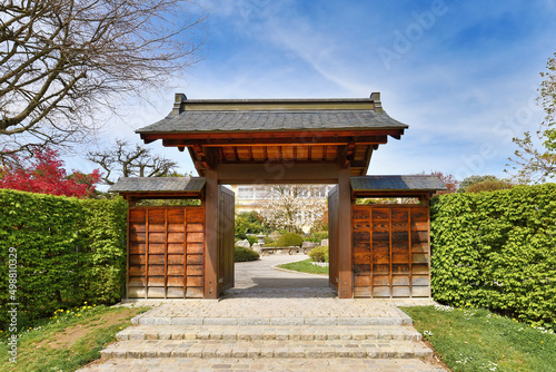 Obraz premium Freiburg, Germany - April 2022: Entrance gate of Japanese garden in public...
