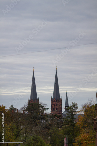 Fototapeta premium Freiburg im Breisgau, Germany - 11 01 2012: The spires of the Church against the grey sky. Empty european street on the cloudy autumn day