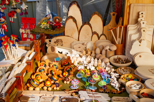 © mirkadirka, Fototapeta premium Freiburg im Breisgau, Germany - 11 09 2012: wooden toys and utensils on display at farmer's christmas market