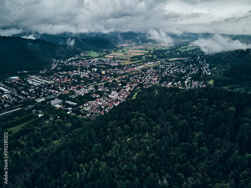 © Tobias, Fototapeta premium Freiburg Littenweiler in den Wolken von oben bei Regen
