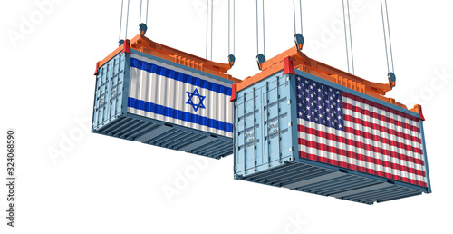 © Marius Faust, Fototapeta premium Freight container with USA and Israel flag. Isolated on white for compositing. 3D Rendering