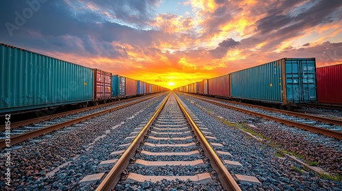 © SAQUEEN, Fototapeta premium Freight train at sunset