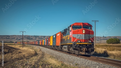© Maria, Fototapeta premium Freight train carrying colorful containers across sunny border landscape in motion