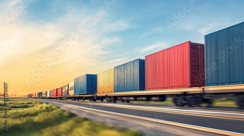 Fototapeta premium Freight train, containers in motion, countryside, 3D illustration