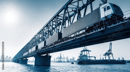 Obraz premium Freight train crossing industrial bridge over water with shipping containers,...