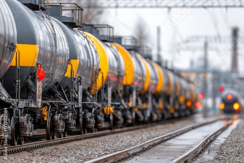 Fototapeta premium Freight train, grey and yellow tank cars, moving on industrial tracks.