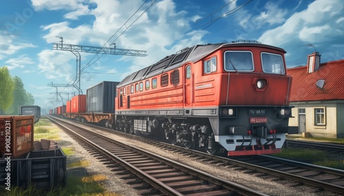 © Marina, Obraz premium Freight train moving on the railway. Locomotive for transporting goods in wagons.