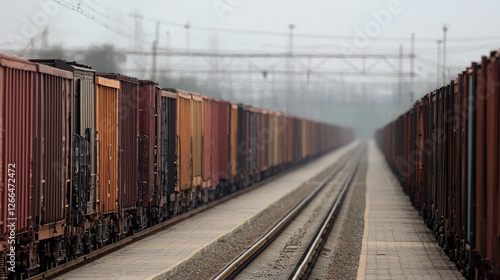 © tugkiara, Fototapeta premium Freight train on misty tracks, industrial area background